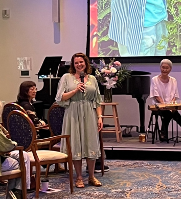 また夫は、大学の英語歌舞伎のために作曲をしてくれた箏奏者のAmyと友人の伸子さんに、会の締めくくりとしてAmyが作曲した箏曲の演奏をお願いした。招待客の方々が会場を退去される時も日本の美しい音楽を弾き続けてくださるとのことだった。